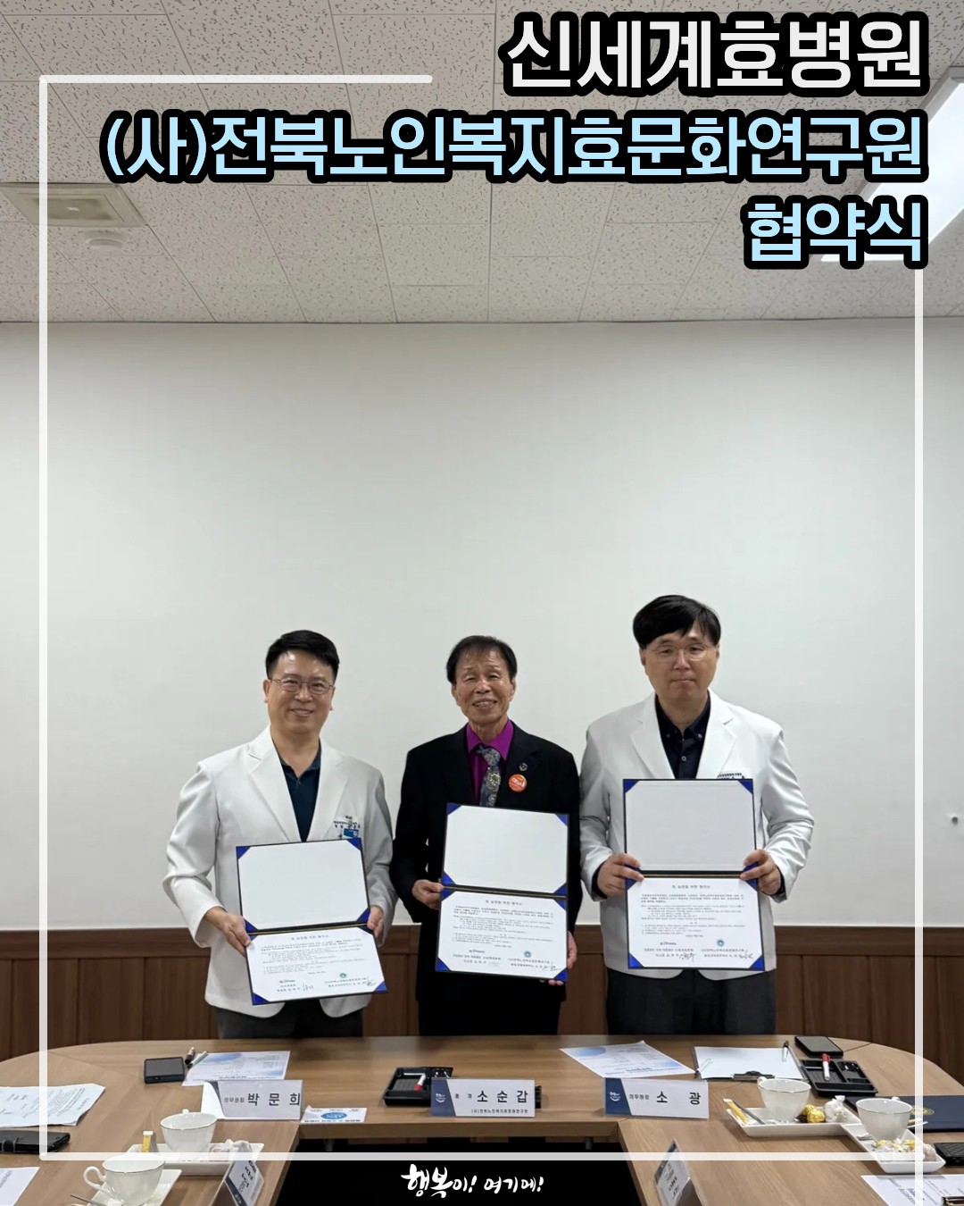 MENU 신세계효병원 이사장 인사말 병원연혁 미션 & 비젼 HI 병원시설안내 의료진소개 진료안내 진료시간 & 오시는 길 입·퇴원 안내 비급여 품목 수수료 원내 전화번호 병동안내 중증 발달장애 나누리발달센터장 인사말 나누리발달센터 이용 행동평가 치료프로그램 나누리학교 정신건강 노인요양 질향상 환자안전 감염관리 진료협력 커뮤니티 병원소식 갤러리 그루터기 소식지 자원봉사 채용소식 알음알음후원회 협력기관 협력기관 MENU 홈 커뮤니티 갤러리 갤러리 제목 신세계효병원 (사)전북노인복지효문화연구원 협약식 작성자 신세계효병원 작성일 2025-10-23 신세계효병원 (사)전북노인복지효문화연구원 협약식2025년 10월 16일(목),신세계효병원은 (사)전북노인복지효문화연구원과 뜻깊은 협약식을 가졌습니다.이번 협약은 어르신들의 건강한 삶을 지켜드리고,더불어 ‘효(孝)’ 문화를 지역사회 속에 널리 퍼뜨리기 위한 마음을 담고 있습니다.신세계효병원은 치료와 회복을 넘어, 지역사회와 함께 따뜻한 가치를 나누는 것이 병원의 중요한 역할이라 생각합니다.이번 협약을 통해 어르신들이 더욱 존중받고 행복한 일상을 살아가실 수 있도록 힘을 보태겠습니다.협약식에 함께한 소순갑 총재는“신세계효병원과의 동행이 지역 어르신들께 큰 힘이 될 것”이라며,“앞으로도 함께 뜻을 모아 따뜻한 지역사회를 만들어가겠다”는 인사를 전했습니다.작은 약속이지만 서로의 손을 맞잡을 때 큰 변화를 만들 수 있습니다.신세계효병원은 앞으로도 이웃과 함께 웃고,함께 성장하는 마음 건강한 지역사회를 위해 꾸준히 노력하겠습니다. 목록 그루터기소 식 지 인스타그램 유튜브 블로그 대표전화 오시는길