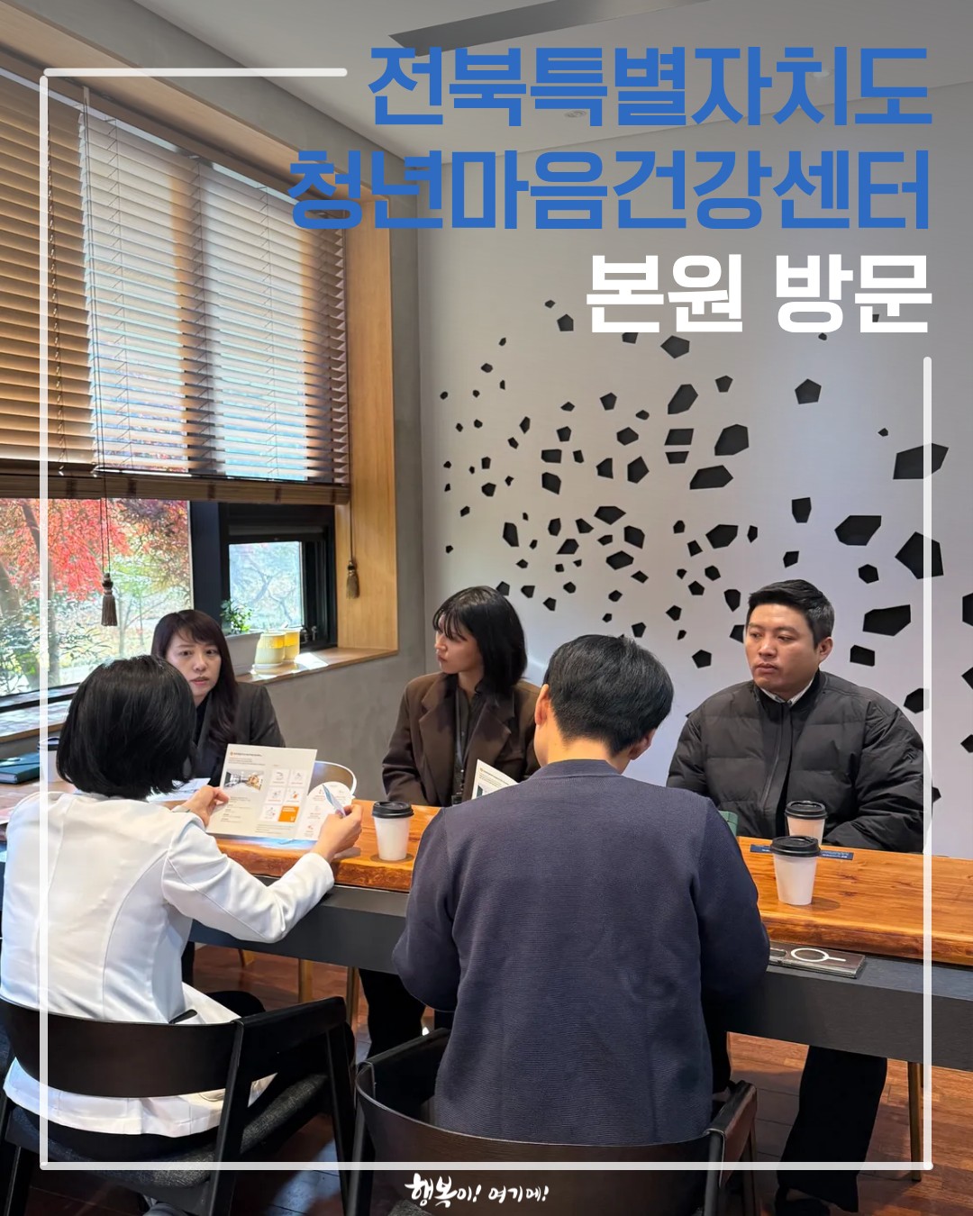 MENU 신세계효병원 이사장 인사말 병원연혁 미션 & 비젼 HI 병원시설안내 의료진소개 진료안내 진료시간 & 오시는 길 입·퇴원 안내 비급여 품목 수수료 원내 전화번호 병동안내 중증 발달장애 나누리발달센터장 인사말 나누리발달센터 이용 행동평가 치료프로그램 나누리학교 정신건강 노인요양 질향상 환자안전 감염관리 진료협력 커뮤니티 병원소식 갤러리 그루터기 소식지 자원봉사 채용소식 알음알음후원회 협력기관 협력기관 MENU 홈 커뮤니티 갤러리 갤러리 제목 전북특별자치도 청년마음건강센터 본원 방문 작성자 신세계효병원 작성일 2025-11-20 2025년 11월 14일, 전북특별자치도 청년마음건강센터가 본원을 방문해청년들의 마음건강을 위한 다양한 지원사업을 안내하는 시간을 가졌습니다.청년마음건강센터는 본원에 방문하여 리플릿을 전달하며치료비 지원, 사례관리, 정서지원 프로그램 등 청년들이 실제로 도움을 받을 수 있는 여러 사업을 소개해본원에 입원 중인 청년들에게 필요한 지원이 닿을 수 있도록 의미 있는 만남을 이어갔습니다.따뜻한 소통의 시간을 통해 청년들이 마음의 어려움을 조금이나마 덜고,필요한 도움에 더욱 쉽게 연결될 수 있기를 함께 기대했습니다.신세계효병원은 앞으로도 청년 한 사람 한 사람에게 가까이 다가가희망과 따뜻함이 머무는 공간이 되기 위해 지역사회와의 소통과 연대를 꾸준히 이어가겠습니다. 목록 그루터기소 식 지 인스타그램 유튜브 블로그 대표전화 오시는길