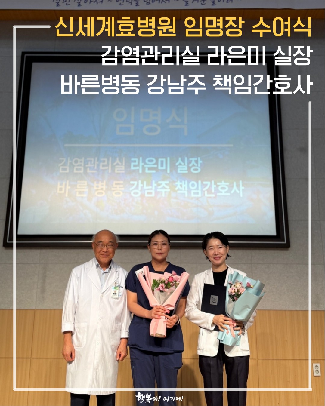 MENU 신세계효병원 이사장 인사말 병원연혁 미션 & 비젼 HI 병원시설안내 의료진소개 진료안내 진료시간 & 오시는 길 입·퇴원 안내 비급여 품목 수수료 원내 전화번호 병동안내 중증 발달장애 나누리발달센터장 인사말 나누리발달센터 이용 행동평가 치료프로그램 나누리학교 정신건강 노인요양 질향상 환자안전 감염관리 진료협력 커뮤니티 병원소식 갤러리 소식지 자원봉사 채용소식 알음알음후원회 협력기관 협력기관 MENU 홈 커뮤니티 병원소식 병원소식 제목 신세계효병원 감염관리실 라은미 실장 & 바른병동 강남주 책임간호사 임명장 수여식 작성자 신세계효병원 작성일 2025-09-04 신세계효병원 감염관리실 라은미 실장 &바른병동 강남주 책임간호사 임명장 수여식25년 9월 3일(수),신세계효병원 감염관리실 라은미 실장 & 바른병동 강남주 책임간호사의임명장 수여식이 진행되었습니다.“더 나은 정신건강 케어를 위해 전문성과 리더십을 강화했습니다”신세계효병원은 환자 중심의 통합 치료 시스템을 실현하기 위해각 분야의 전문 인력들이 함께 협력하며 성장해 나가고 있습니다.함께여서 더 강한 신세계효병원.서로를 믿고 성장하는 팀워크가 환자분의 회복을 더욱 따뜻하게 만듭니다.앞으로도 신세계효병원은 전문성과 마음을 다해, 늘 곁에서 함께하겠습니다. 목록 그루터기소 식 지 인스타그램 유튜브 블로그 대표전화 오시는길